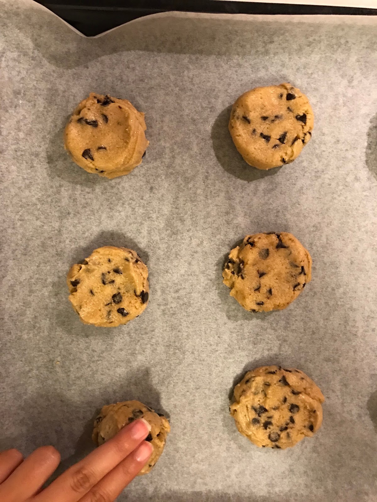 • Eğer iki parmağınızla küre şeklindeki kurabiyelere hafif basıp biraz düzlerseniz (soldaki gibi), fırından çıktığında o kurabiye dükkanlarında görüp beğendiğiniz irice görünümlü nispeten ince ve yassı chocolate chip cookielerden olur.